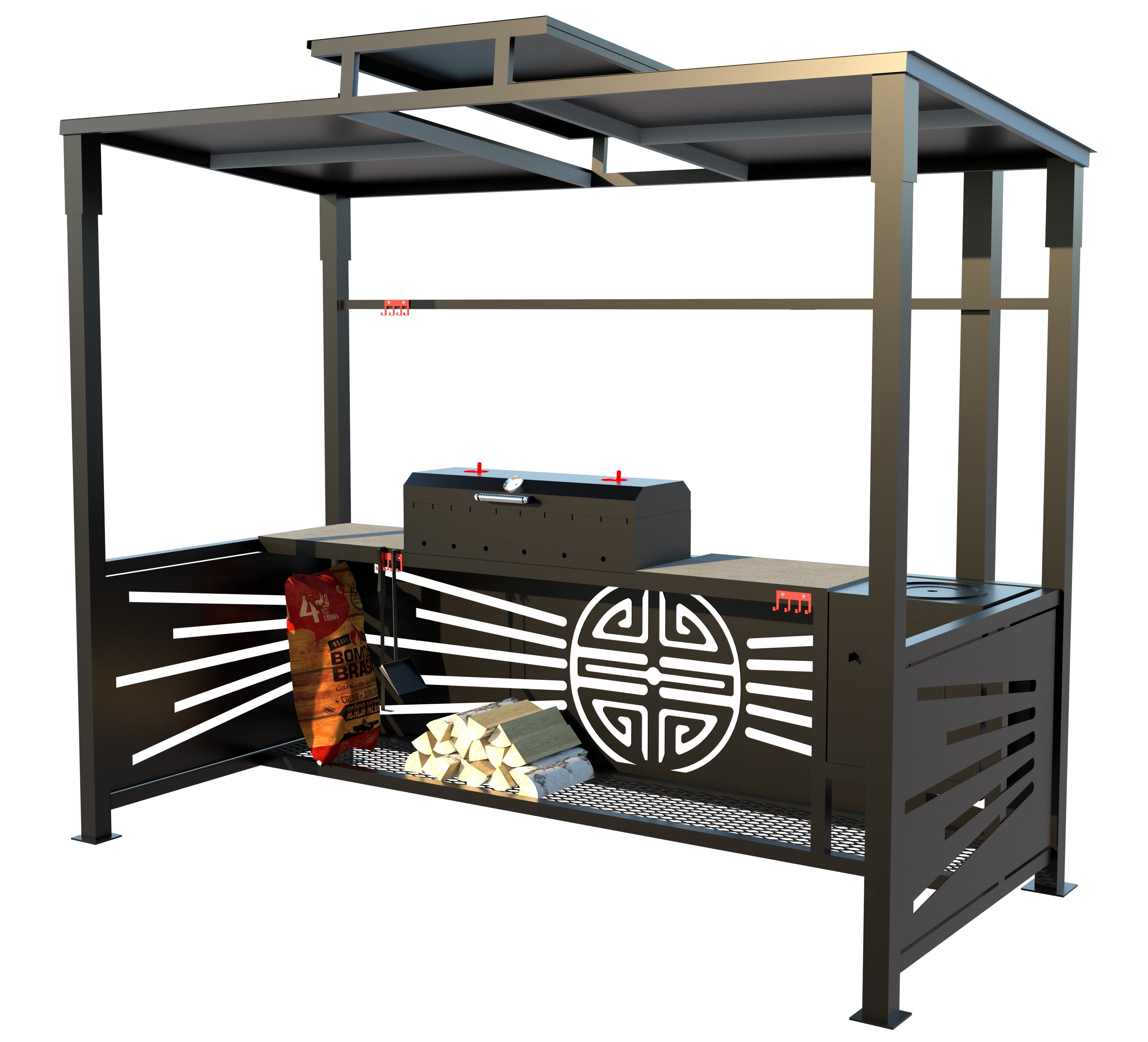 Каркас с крышей, мангал, печка, дымоход, совок, кочерга и подвес для казана |